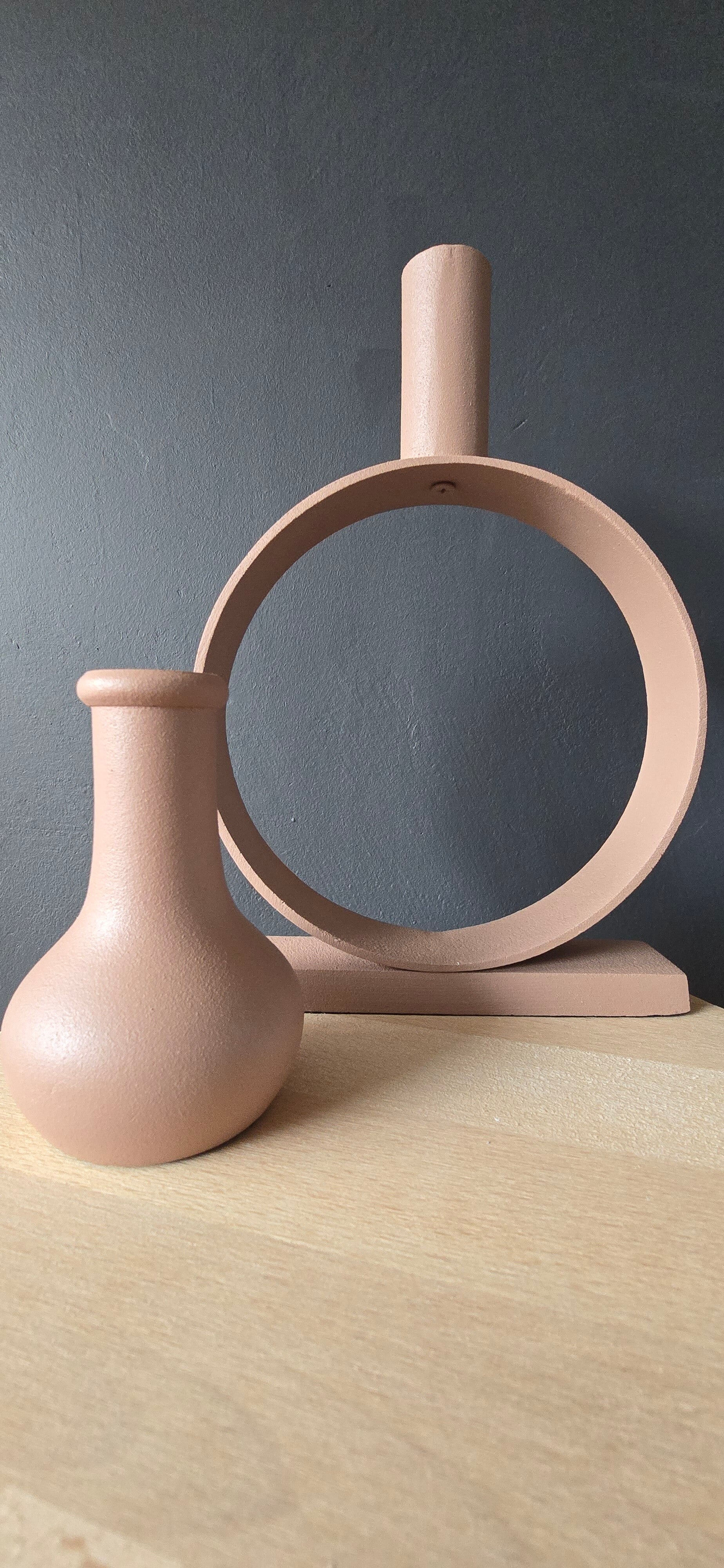 Met zijn unieke ronde design en zachte roze tint is deze kandelaar een echte blikvanger op de eettafel, salontafel of in de hal.